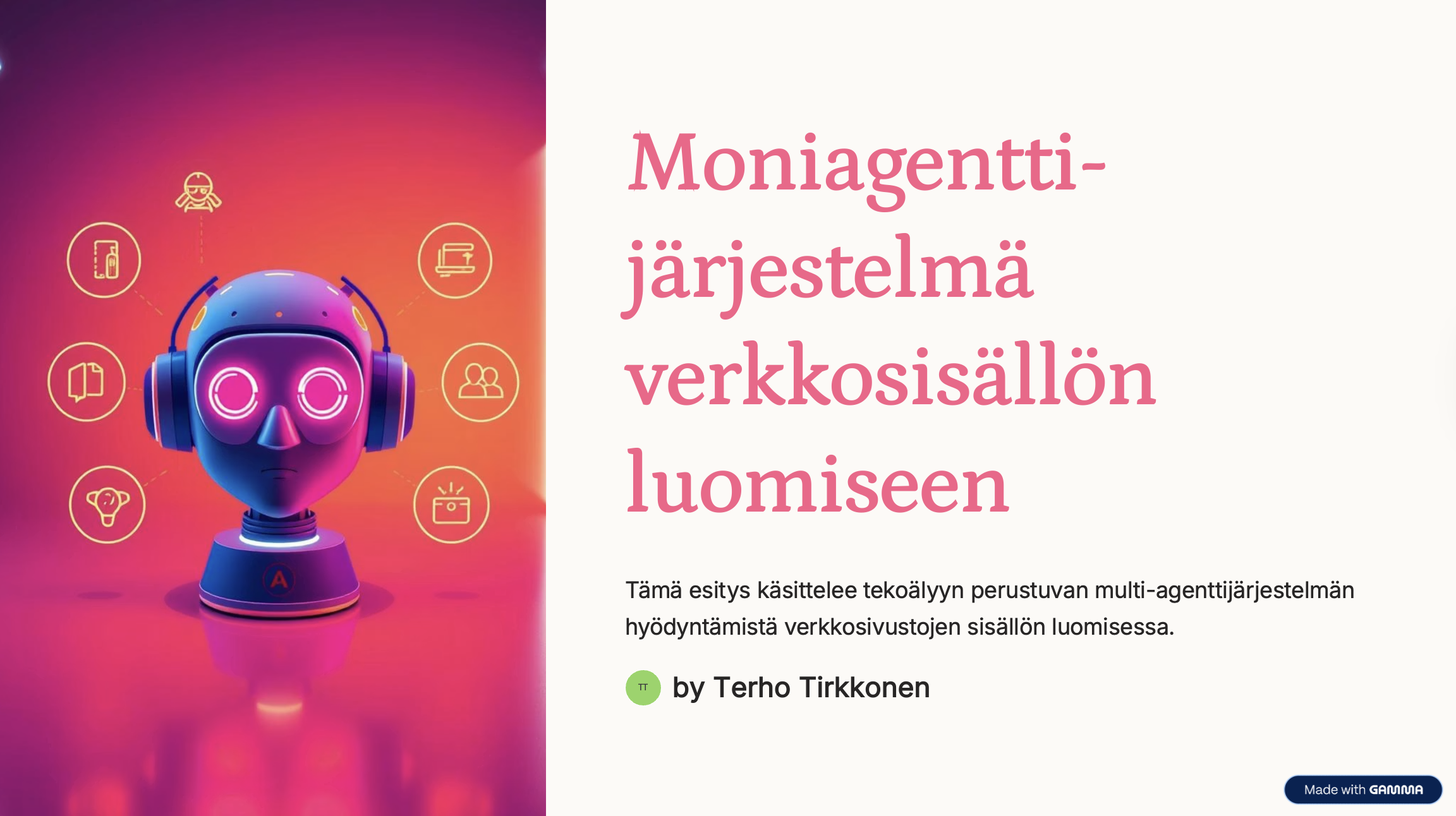 Sen ehkä mielenkiintoisin puoli on varsinaisen sisällön keksiminen ja alla on esimerkkinä kuvakaappaus jo syksyltä 2024, kun kehotin lyhyesti Gammalle ideani ja se suunnitteli sekä koko esityksen sisällöt että visualisoi sen tyylikkäästi: